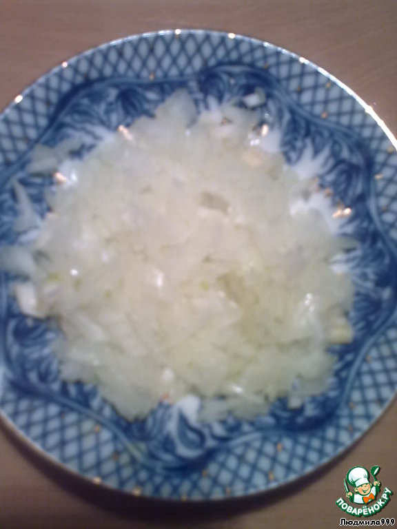 ВТОРОЙ СЛОЙ - лук мелко нарезать, посыпать на первый слой, промазать майонезом.