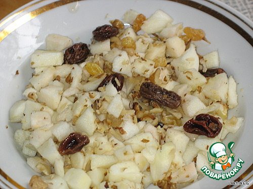 добавить изюм (предварительно распаренный и очищенный от хвостиков) и мелко порубленные орехи.