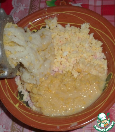 Все перемешиваем, солим и заправляем майонезом. Из полученной массы формируем шарики и выкладываем нашу гусеничку!