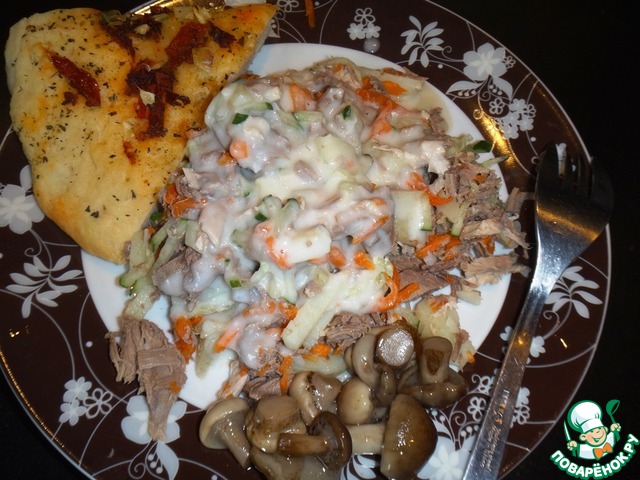 Салат перемешайте, я не солила и ничем не приправляла. Каждый сам поливает себе соусом столько, сколько нравится и приправляет специями. Можно на основе бульона сделать другой соус, я пока не экспериментировала