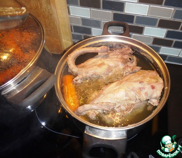Бывает так, что дичь сильно разбита на охоте, красивого блюда уже не получится, поэтому ее можно отварить и вкусно скушать в салате:) Отвариваем двух не крупных тетеревов с 1 луковицей, 1 морковкой и перцем горошком и парой листиков лаврового листа, примерно 1 час.
