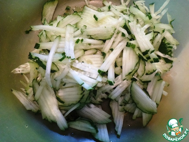 Шинкуем мелко огурец и яблоко, если вы не любитель экзотики, яблоко не кладите