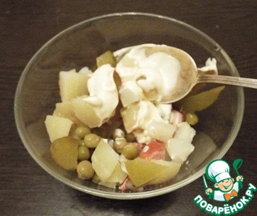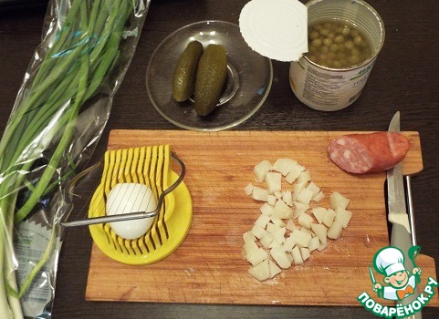 Нарезаем кубиками салат из вареного картофеля (4шт), вареных яиц (2шт), соленых огурцов (2шт), колбасы (100гр), добавляем консервированный горошек (5 ст. л.) и мелко порезанный зеленый лук.