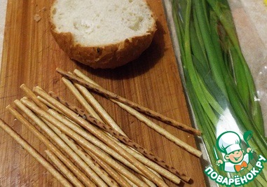 Для корзиночки понадобиться булочка, зелёный лук, солёная соломка.