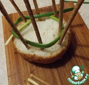А вот собственно и процесс приготовления нашей корзинки: С булочек срезаем верхушку. Потом по кругу булочки вставляем соломку 10-12 штук. Берём зелёный лук и начинаем переплетать между палочками в шахматном порядке. Продолжаем плести нашу корзинку до самого верха. Итак, наша корзинка готова, наполняем её салатом.