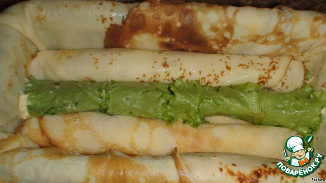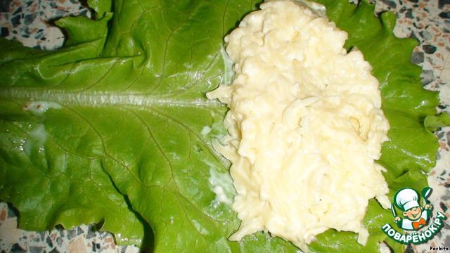 На лист салата выкладываем сырно - чесночную начинку с добавлением майонеза.