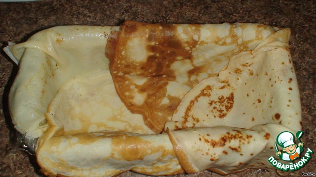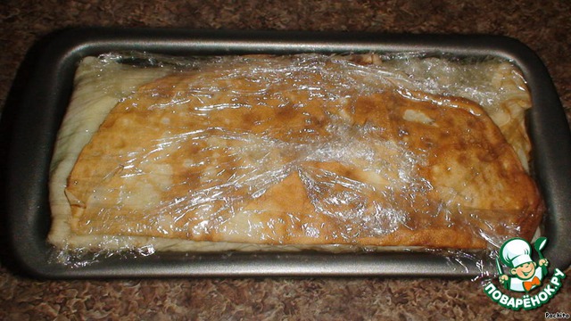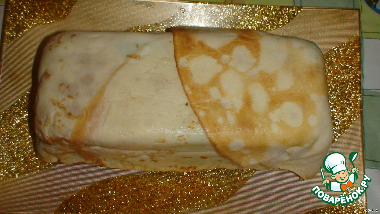 Верх закрываем концами блинов, накрываем пищевой пленкой и ставим форму под груз не менее,тчем на 10 часов.