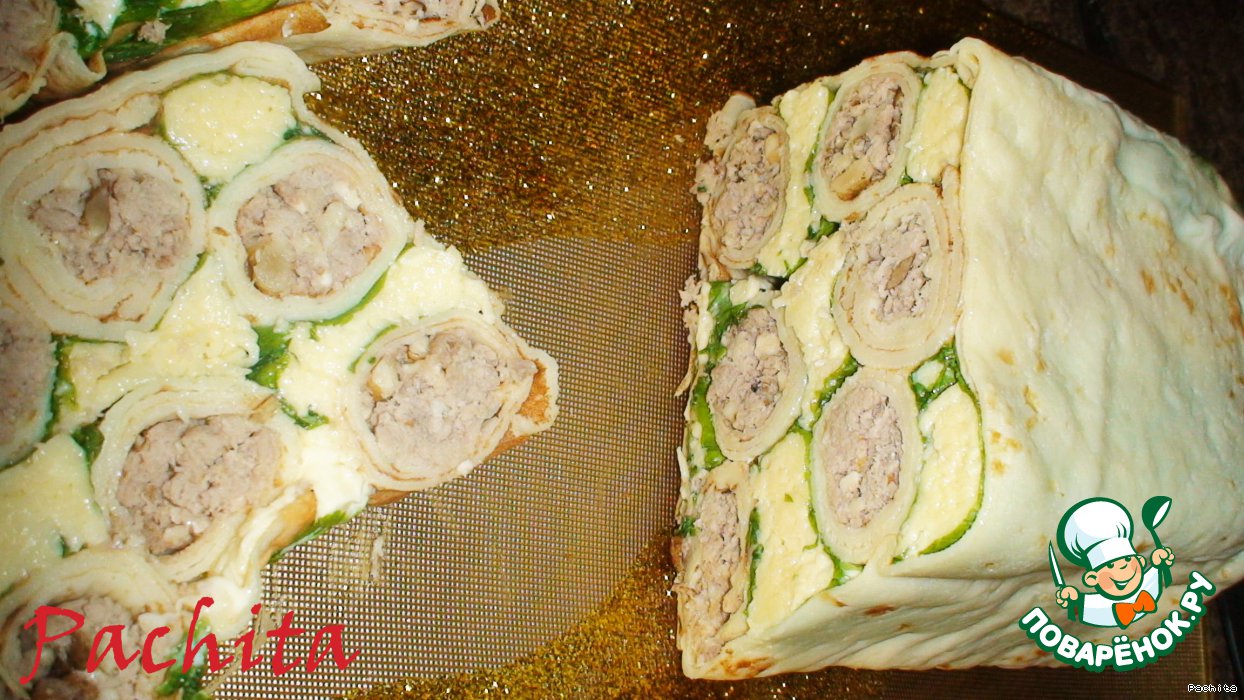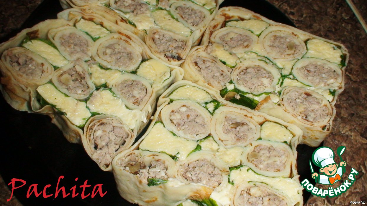 На блин кладём начинку и мяса, пропущенного через мясорубку с обжаренным луком и измельченным орехом, с добавлением майонеза. Сворачиваем рулетиком.