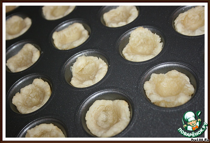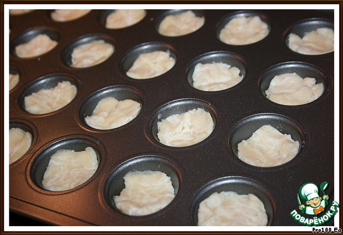 5. Разделить тесто на 24 кусочка и нажать их на дно формы мини-маффинов. В духовку - 200*С на 10 минут.