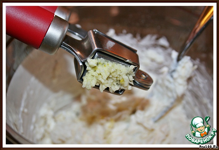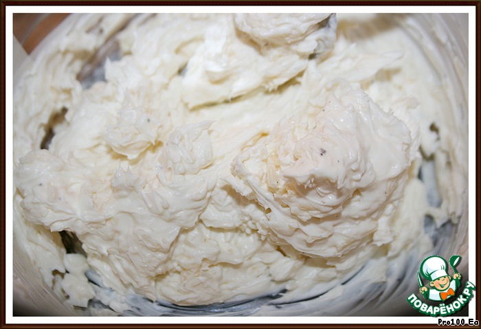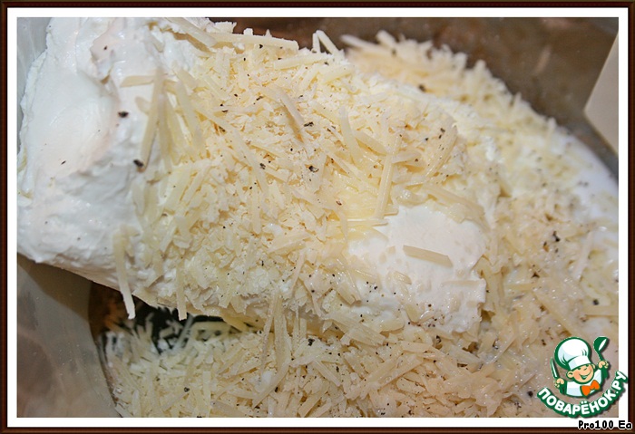 6. Готовим начинку: сливочный сыр (творог) соединить с пармезаном, черным перцем и молоком, перемешать.