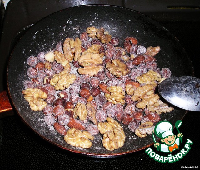 Выложите на сковороду любые орешки, или обычные семечки и жарьте на среднем огне постоянно помешивая.