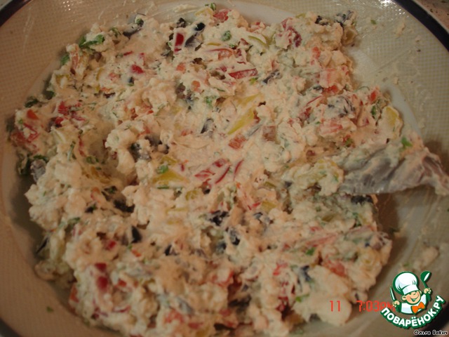 Приготовим начинку: сыр фета помять вилкой, добавить сметану, филадельфию, чеснок перемолотый, специи, порезанные маслинки.