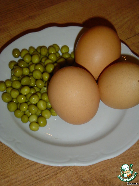 Отвариваем яйца, отцеживаем консервированный зеленый горошек.