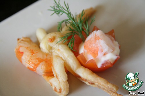 Поставить креветки с тестом в духовку (180 градусов) на 15 минут. Остальные креветки мелко нарезать. У помидоров черри отрезать верхушку, извлечь мякоть, наполнить майонезом, сверху выложить нарезанные креветки.