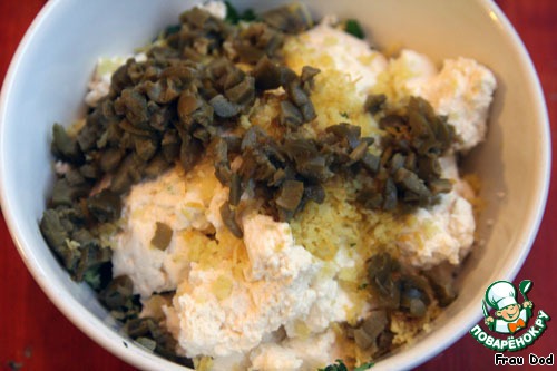 В миску с листьями петрушки добавить рикотту и вторую треть цедры, мелко нарезанные оливки, добавить перец и перемешать.