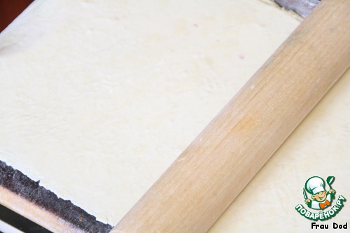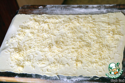 Тесто раскатать в тонкий пласт, одну половину сверху посыпать тертым сыром.