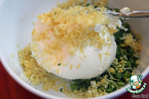 В миску со стеблями добавить творожный сыр, треть имеющейся цедры. Все перемешать.