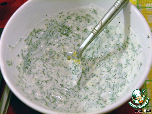 Покрошить укроп, добавить йогурт, оставшуюся цедру и раздавленный чеснок.
