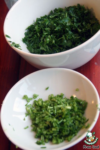 Петрушку вымыть, высушить, отрезать стебли, мелко покрошить стебли и листья, сложить в разные миски.