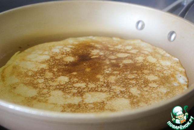 На хорошо разогретой сковороде, смазанной растительным маслом выпечь тоненькие блинчики.
