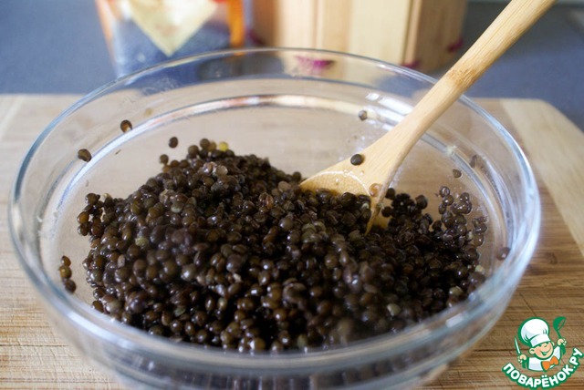 Готовую чечевицу промыть, заправить оливковым маслом, соевым соусом и перцем по вкусу. Масло придаст дополнительный блеск, а соевый соус добавит соли и вкуса.