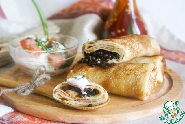 Подавать блинчики теплыми со сметанным соусом. Отрезая кусочки и зачерпывая соус, есть ложкой;), и пусть на ваших столах всегда будет столько икры, чтобы ее можно было есть ложками!