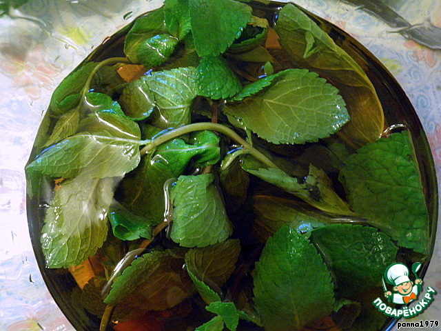 Заливаем мяту коньяком. Закрываем крышкой и ставим в темное место настаиваться на 1-2 недели (я остановилась на 1,5 неделе).