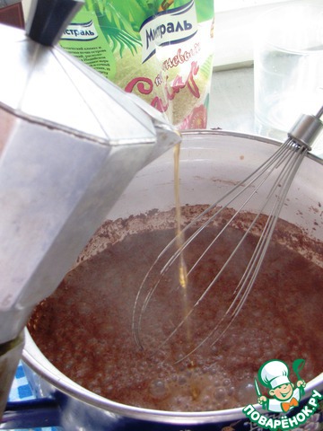 Отдельно варим кофе. Я это делаю при помощи гейзерной кофеварки. Можно любым другим способом. Кофе нужен не очень крепкий. Вливаем его к шоколадной смеси. Перемешиваем.
