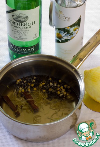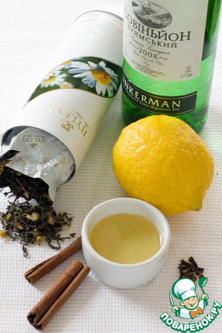 Для приготовления этого элегантного, чисто женского глинтвейна нам понадобится совсем немного - сухое вино, мед, ромашковый зеленый чай, цедра лимона, корица и гвоздика