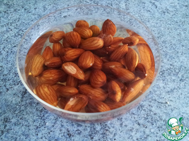 Все очень просто. Сначала мы замачиваем миндаль на ночь в воде, чтобы он набух