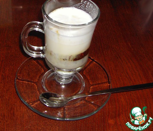 Сварить кофе, взбить молоко в пену. Я делала кофе с помощью кофе-машины, молоко взбивала паром. Подогретое до 60-70 С молоко также можно взбить с помощью френч-пресса или венчика.