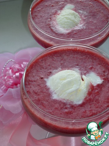 Наполнить бокалы коктейлем, положить по шарику мороженого