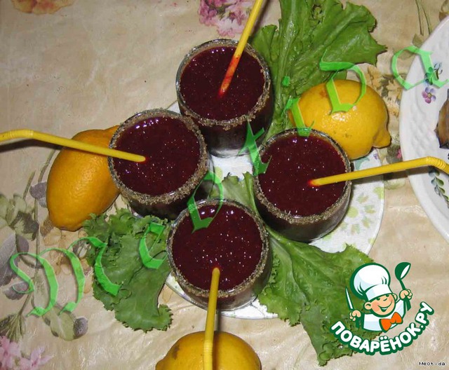 Края стаканчиков обмакнуть в лимонный сок, а затем в тростниковый сахар (можно обычный), вылить получившийся коктейль в стаканчики.