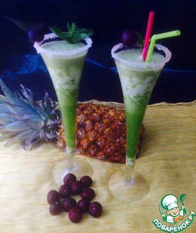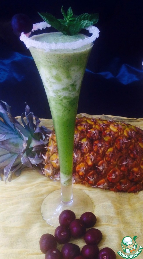 Выложить в миксер листья мяты, ананас, яблоко, 4-5 кубиков льда. Сахар по-желанию. Взбить коктейль