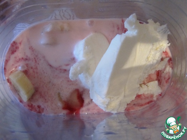 Влить йогурт, добавить мороженое, взбивать 2-3 минуты до образования однородной смеси.