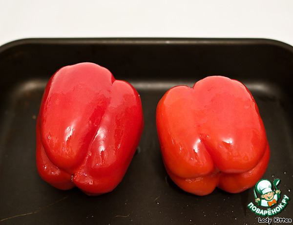 Перцы проколоть зубочисткой в нескольких местах, смазать оливковым маслом и отправить в разогретую до 180°С духовку примерно на 30 минут.