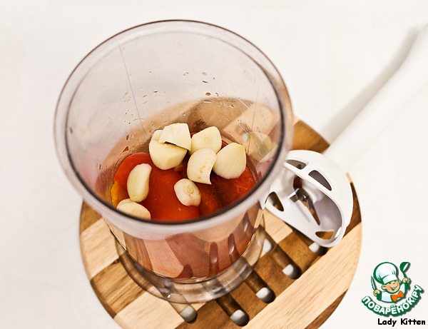 Очищенные перцы перемолоть в блендере вместе с чесноком.