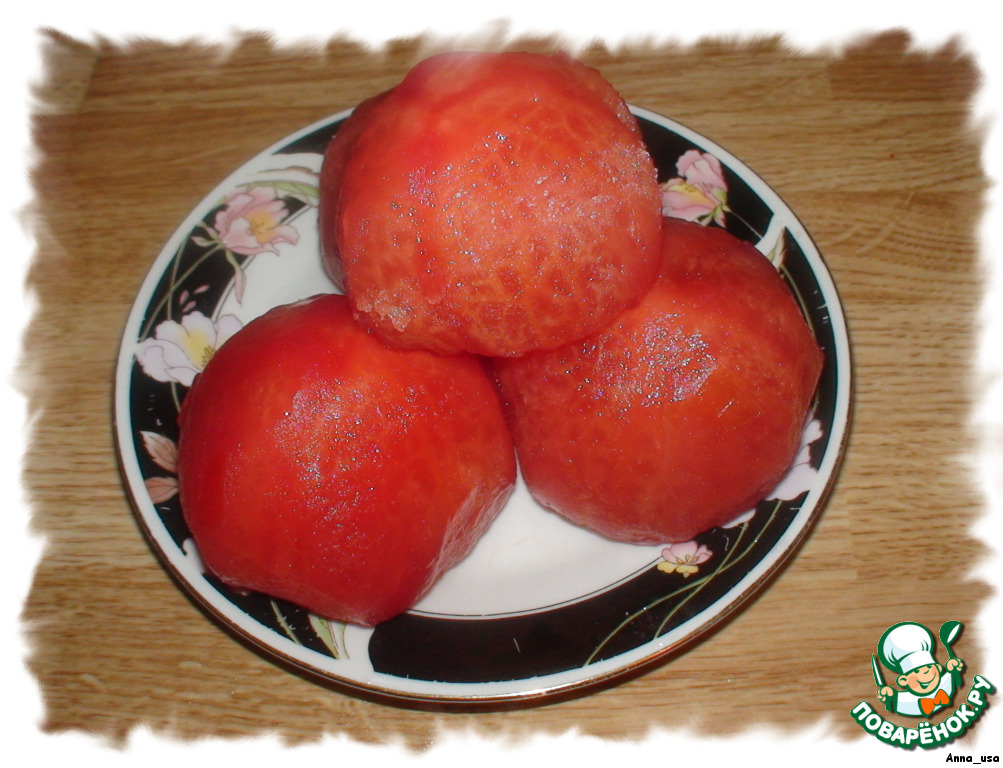 Помидоры очистить от кожицы. Я где-то слышала, что правильно очищать помидоры ножом, а не обдавать их кипятком, так как при обдаче кипятком изменяется их вкус.