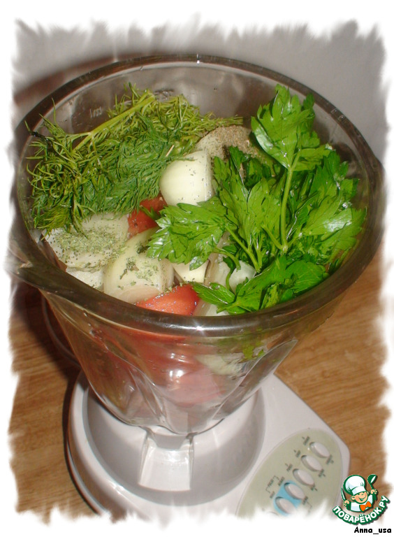 Очищенные помидоры, укроп, петрушку, лук (порезанный на кусочки), базилик и мяту, сложить в блендер и превратить в пюре.
