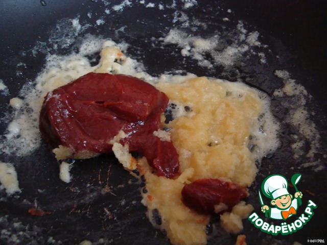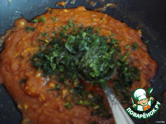 Добавить немного бульона, 1 ст.л. томатной пасты, специи по вкусу. Немного проварить.