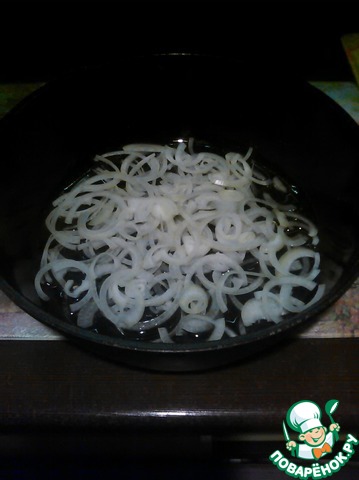 Режем лук полукольцами. В сотейник наливаем растительное масло и обжариваем в нем лук до слегка золотистого цвета.