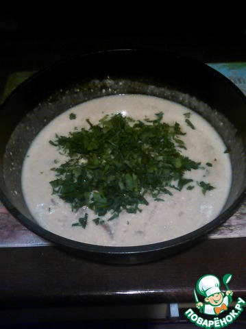 В конце добавляем сметану и зелень. Ставим на тихий огонь на 2 минуты. Не даем закипеть! Все, соус готов. Подаётся горячим. Приятного аппетита!