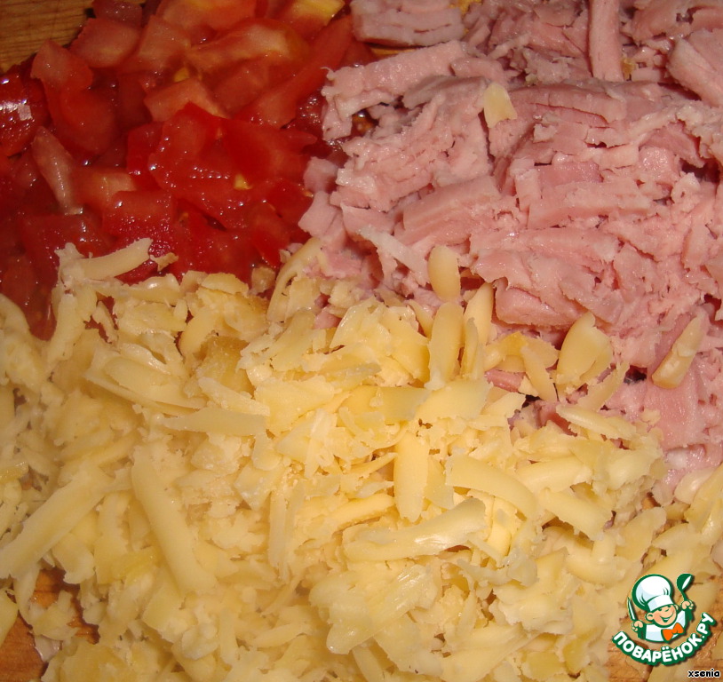 Мелко режем ветчину, помидор - это в данном случае (грибы, перец сладкий, оливки, зелень и т. п., в общем то, с чем вы любите обычную пиццу. Каждый делает на свой вкус)