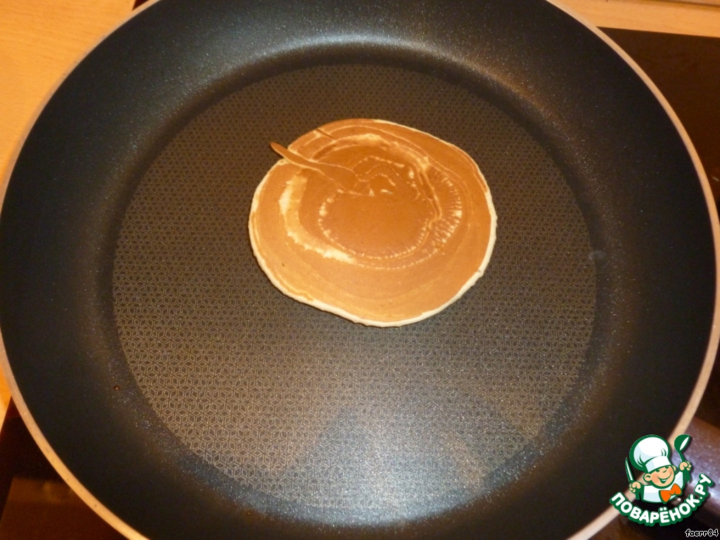 хорошенько разогрейте сковороду с антипригарным покрытием, потом уменьшите огонь до среднего и выпекайте оладьи по одной штуке следующим образом: налейте тесто на сухую сковороду,