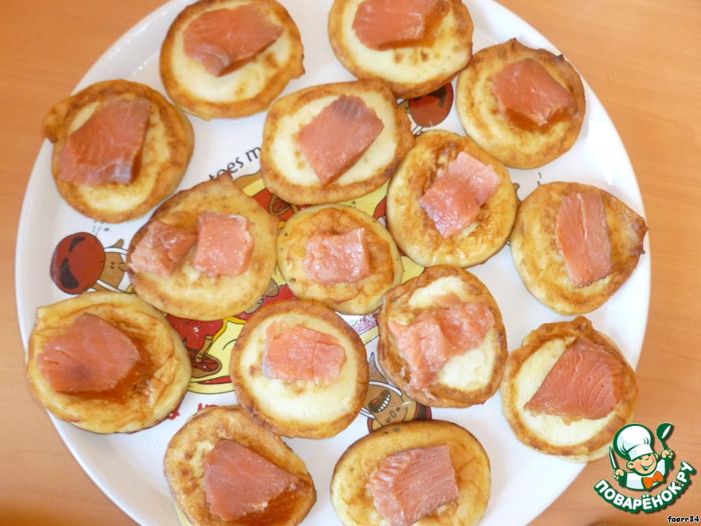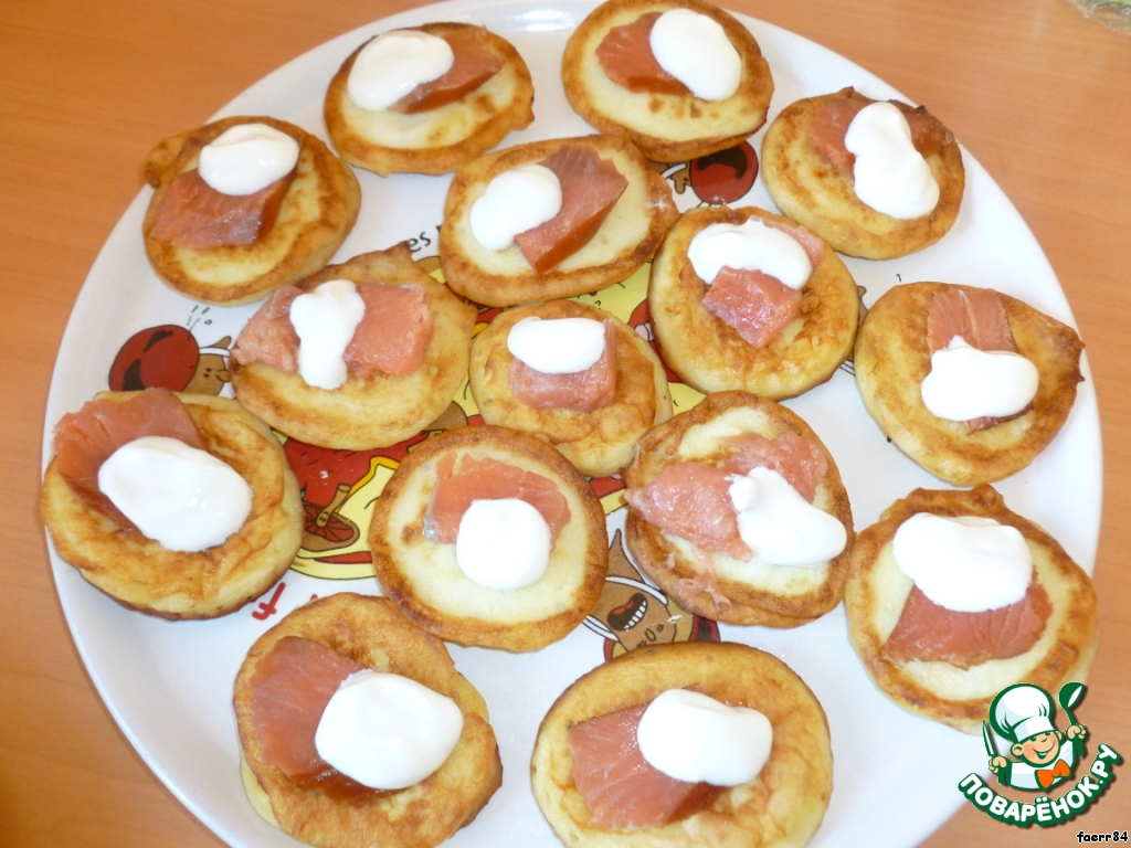 | По рецепту журнала «Cosmopolitan». Эта закуска на столе появляется практически мгновенно (и исчезает с него так же). Сами блинчики можно испечь заранее, упаковать в герметичный контейнер и хранить в холодильнике несколько дней. Перед подачей их нужно будет только украсить ломтиками рыбки или красной икрой. |