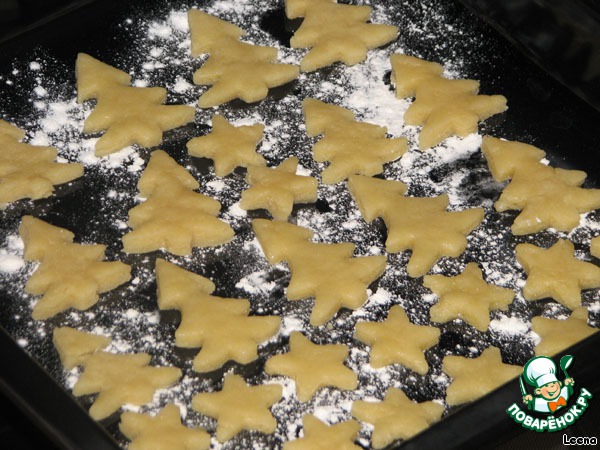 Из оставшегося теста я приготовила печенье. Противень смазывать не нужно, я для подстраховки чуть присыпала мукой.