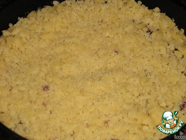 Сверху на терке натереть песочную крошку, прикрыв всю начинку. Трется очень легко. не нужно никаких усилий!