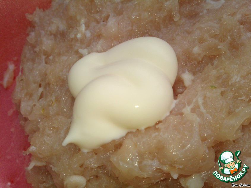 В фарш добавим майонез для мягкости и добавим к общей массе