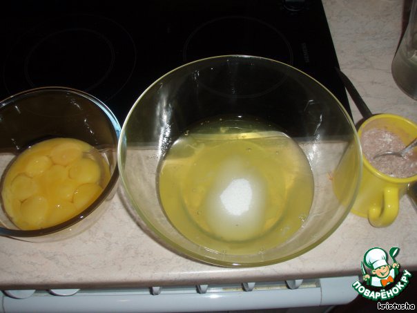 Какао с мукой осторожно слегка перемешать со взбитой массой (не рекомендуется перемешивать тщательно,так как при перемешивании масса оседает)Выложить на противень с пергаментной бумагой, разровнять. Форма у меня 36 на 25 см