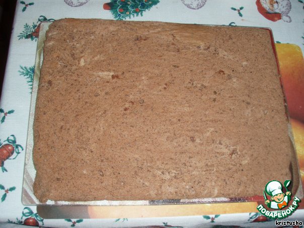 Готовый корж разрезать так, чтобы получилось 3 коржа (я это сделала так: нижний- целый корж,средний - из двух частей, верхний- целый):